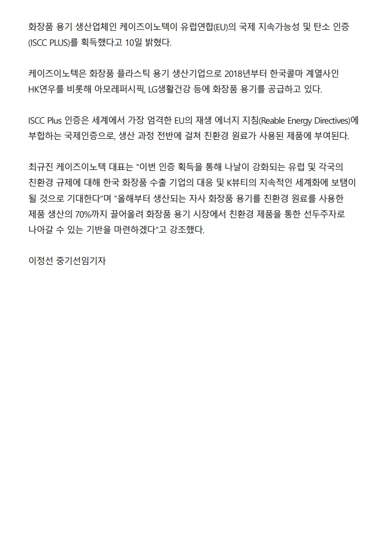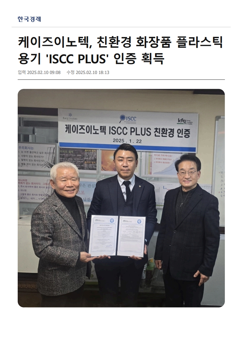 케이즈이노텍, 친환경 화장품 플라스틱 용기 ISCC PLUS 인증 획득 | 한국경제